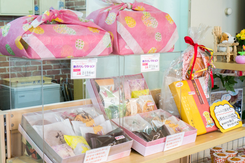 風呂敷で上品に包まれたお菓子の詰め合わせなどギフト商品が並びます。