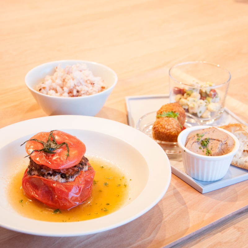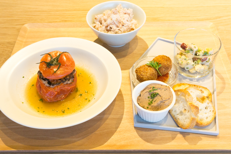 〈メイン〉…メインは2種類から選択。取材時のメニューは「トマトファルシ(トマトの肉詰め)」か「サーモンと彩り野菜のさっと煮」かで選べました。