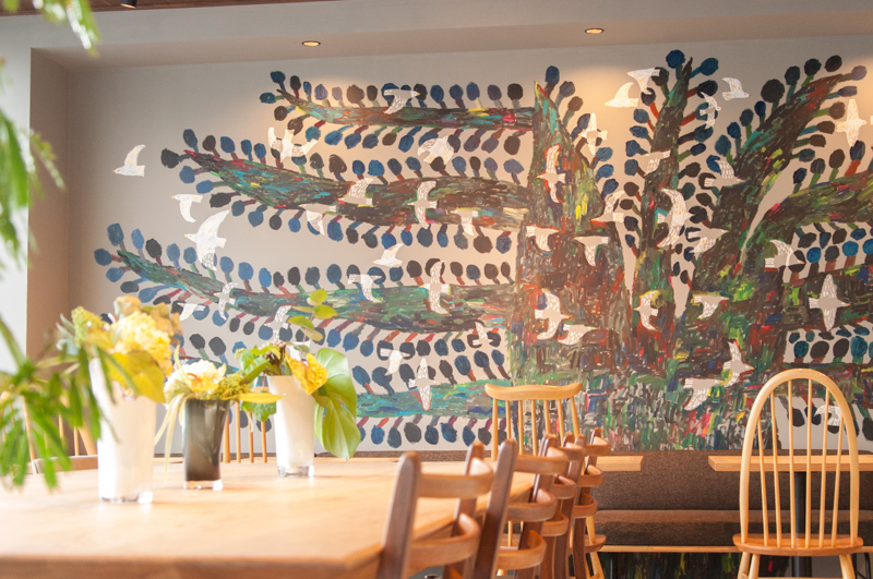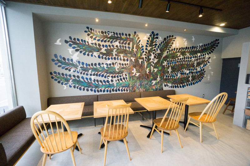 人とのつながりを大事に、人が集まる止まり木になるようなそんなカフェにしたいという意味を込めたそう。お店のコンセプトとミロコマチコさんの絵が不思議と自然に混ざり合って素敵な空間をつくりだしています。
