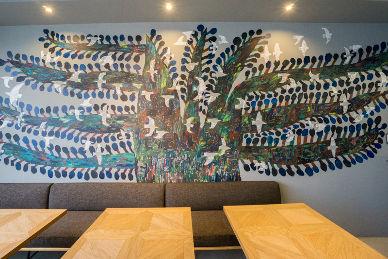 どっしりと構えた木の絵はミロコマチコさんが描いたもの。ミロコマチコさんについては後ほど詳しくご紹介します!
