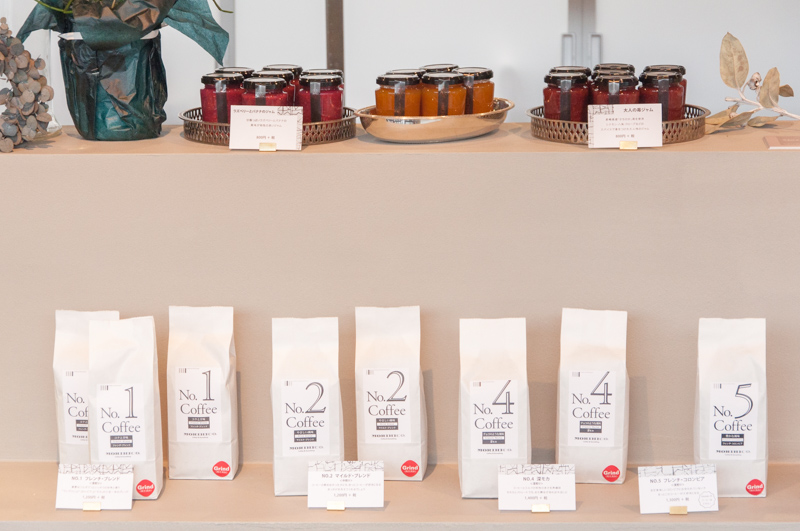 ショーケースの隣にはジャムや珈琲豆などの販売も。ついつい手に取ってしまいそうなパッケージ。