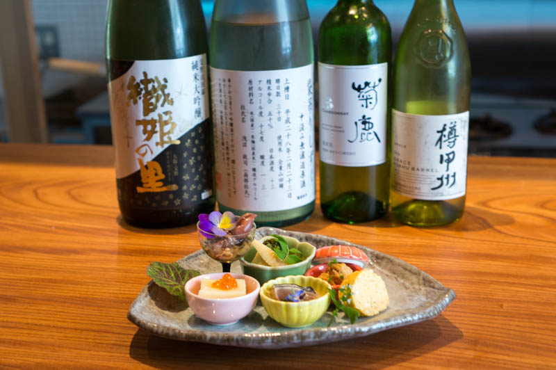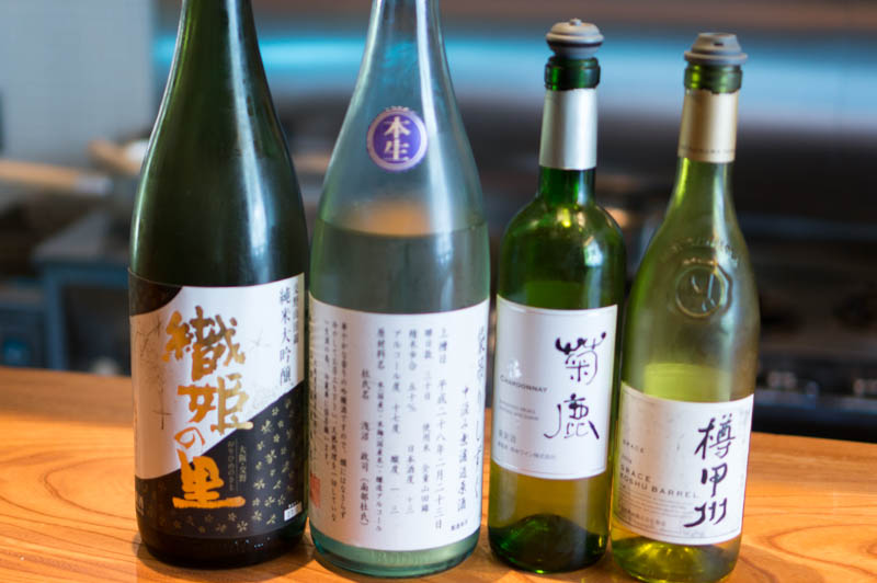 カウンターの奥にはこだわりの日本酒とワインが。