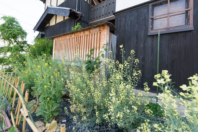 お店の裏の自家菜園には、お花や野菜などが植えられていました。