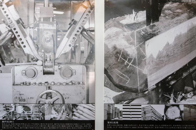 左の写真が木材を機械で曲げているようす。右の写真は丸太を切っているようす。