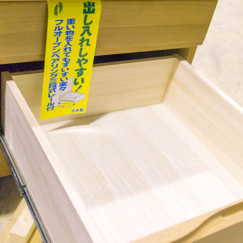 右側の引き出しは奥まで開くことができ、なおかつ重いものを乗せても軽く引き出すことができます。