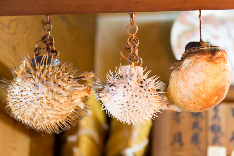 頭上にはハリセンボンとフグの剥製が吊るされていました。