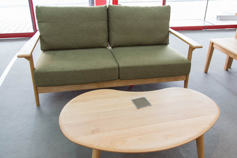 ポケットコイルスプリングを使用した北欧風ソファと、無垢のアルダー材を使用したリビングテーブル。