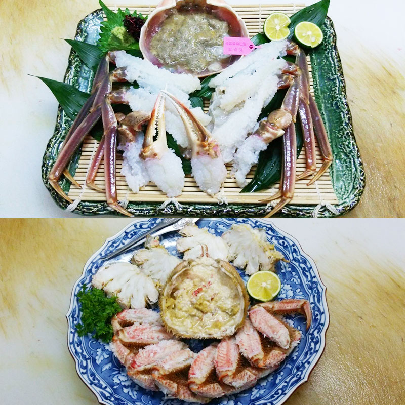 上から 茹で蟹(毛ガニ)、ずわい蟹のお造り 各メニュー 時価