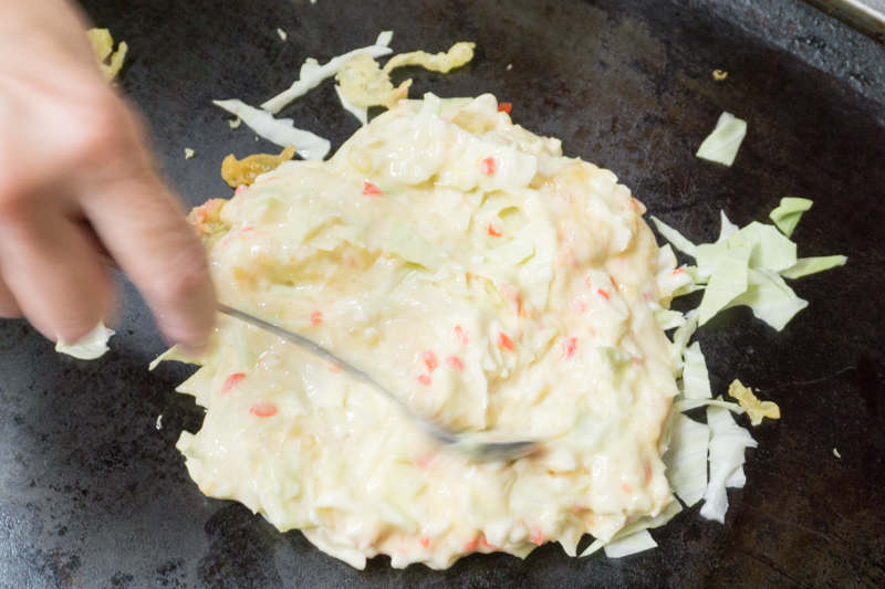 ふわふわの食感のお好み焼きをアツアツの鉄板でいただきました。