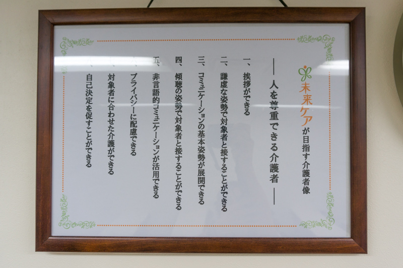 教室には未来ケアが目指す介護者像が掲げられていました。