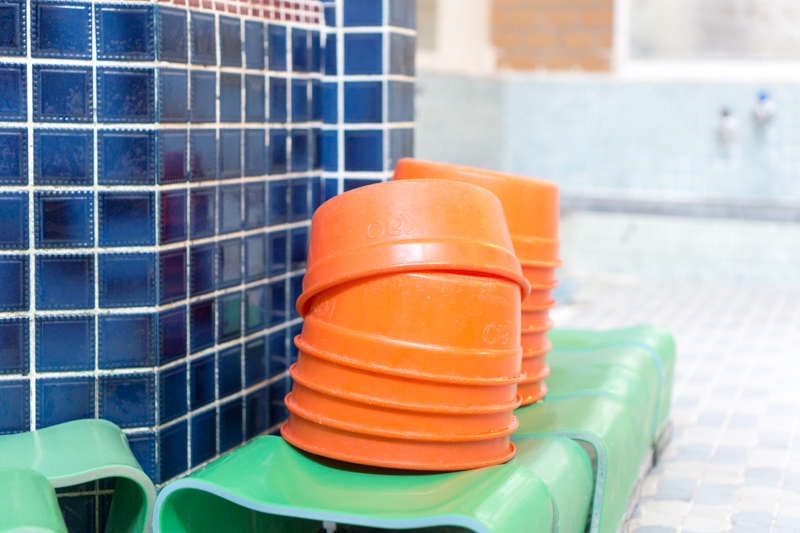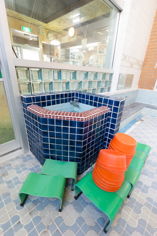 入ってすぐの所にはかけ湯。洗面器と椅子もスタンバイ。