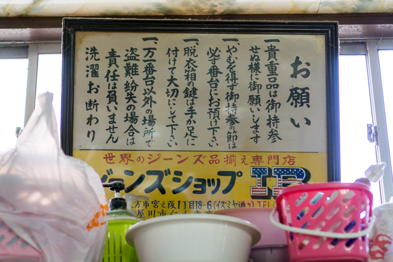 「脱衣所でのお願い」の前には、常連さんのお風呂セットが並んでいました。
