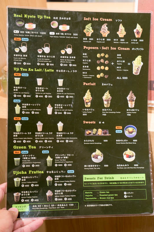 メニューには、グリーンティやお茶のソフトクリーム、あんみつなどなど。