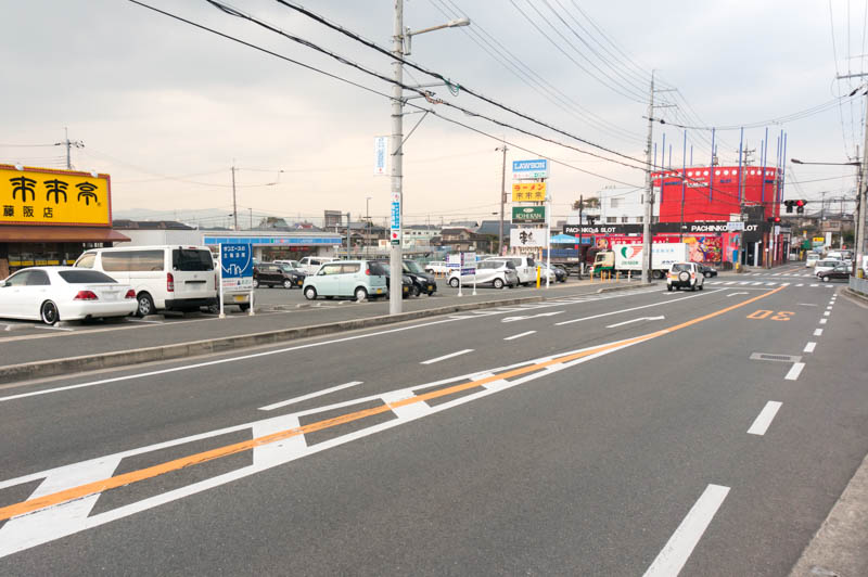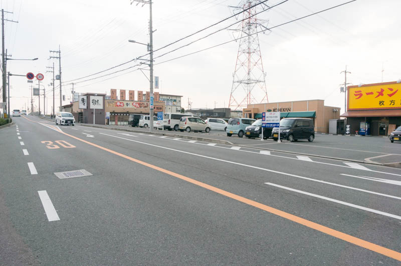 お店の前を通る府道736号線をコッチへまっすぐ行くとJR長尾駅の方へ。