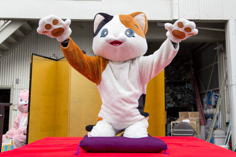 落語用の高座に座っているのはレンタル用のネコちゃんの着ぐるみ。