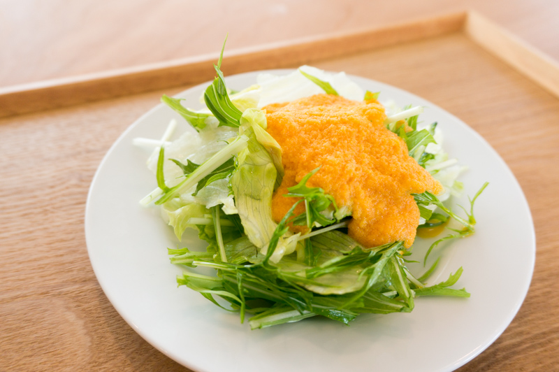 前菜として、自家製の人参と玉ねぎのドレッシングたっぷりのサラダがでてきます。