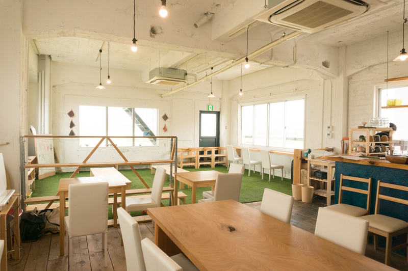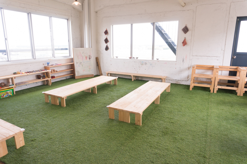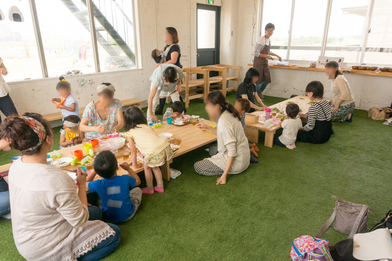 この芝生スペースは真ん中のテーブルを自由に動かすことができるので、ママ会やママ向けイベントで広々使うことができます。