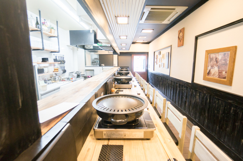 お店に入ると、カウンター席がずらり。白と黒を基調にしたおしゃれな店内は、カフェやダイニングのようで、女性の方でも入りやすそうな雰囲気。