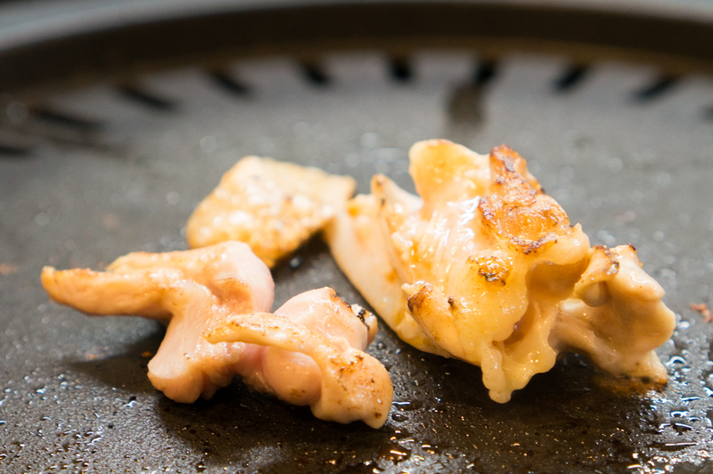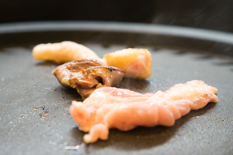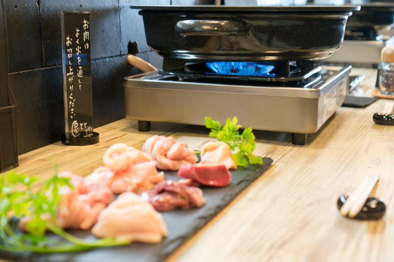 こちらのお店は自分で鶏を焼くのが特徴で、席には鉄板があります。