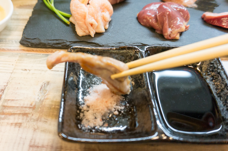 タレと岩塩をつけて食べるもよし、プラス注文で明太マヨ・チーズ・梅の3種類(写真上から順)のディップソースもあります。(各+50円)