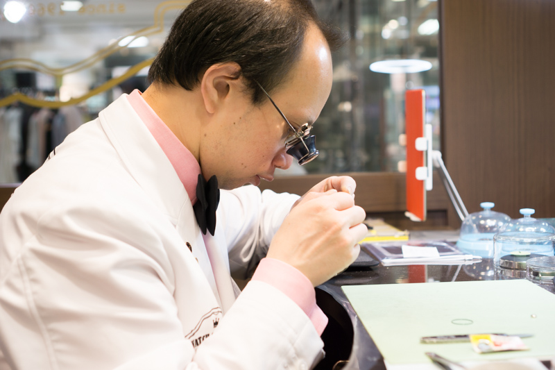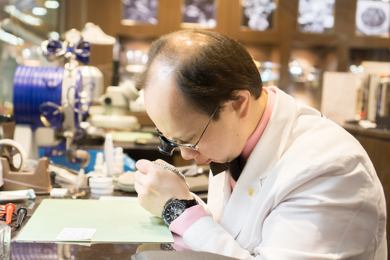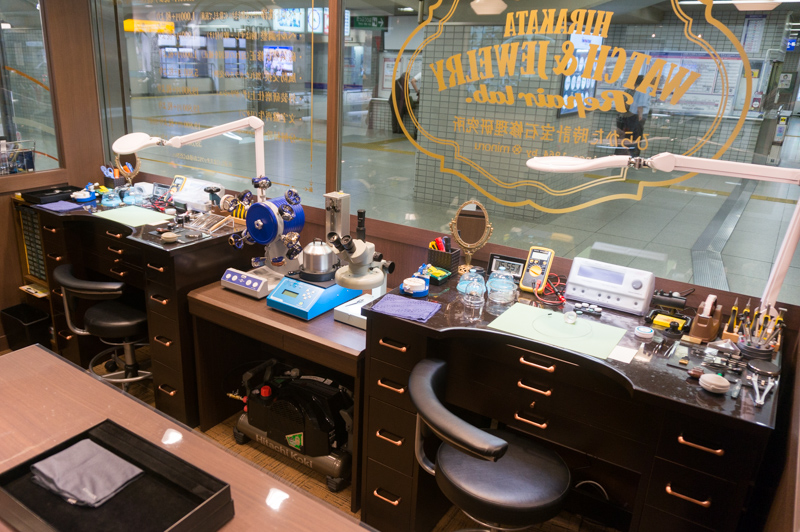 窓際には時計修理工房が設置されていて、外から作業の様子が見えるようになっています。
