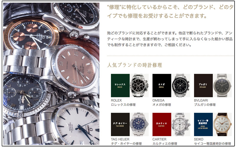 修理の対応ブランドは国内外問わずできる限り対応しているとのことで、料金はお客さまの時計のタイプや故障状況を確認して都度ご案内しているとのこと。(→参考価格はこちら)