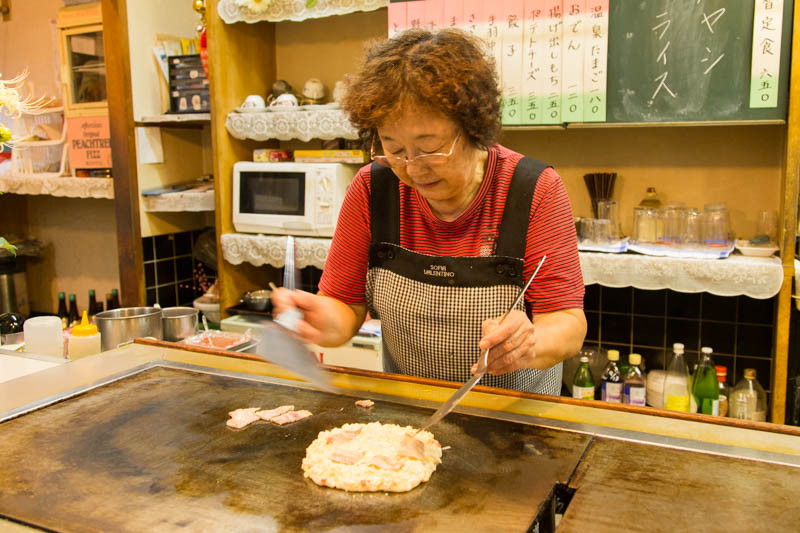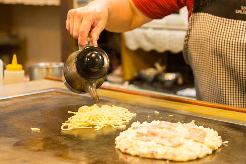 何やら麺を焼き始めたお母さん。それを生地の上に乗せて…