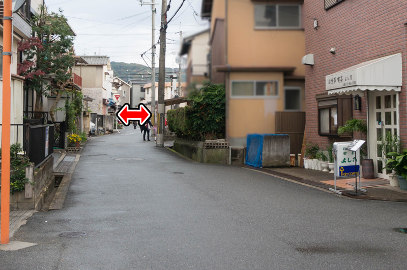 お店の前の道を写真奥の方へ進むと赤い矢印のところに左右に分かれる道路があります。