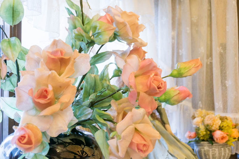 店内には奥様が作った造花のフラワーアレンジメントがたくさん。
