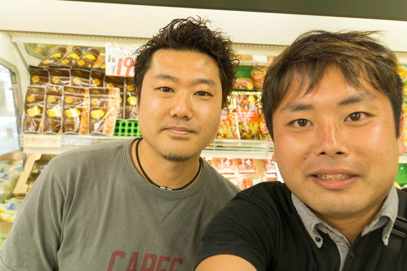(サンパークで果物などを担当しているオザキさん(左)。なぜか一緒に撮るなら撮影OKとのことで半笑いのすどん@ひらつー(右)と)
