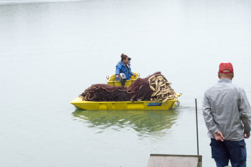そして舟は池の中央あたりに移動し、網の片側を設置。
