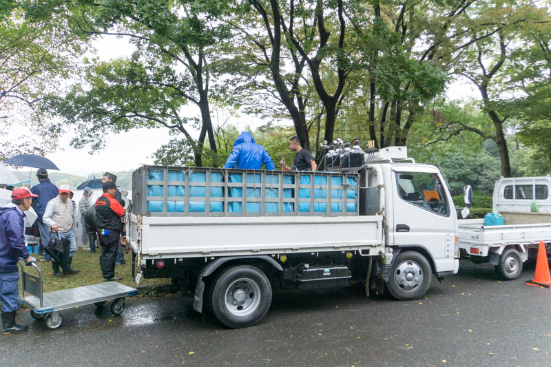 捕らえた在来魚はトラックに積まれたいけすに移動され、その後は園内の別の池へ移送されたそう。