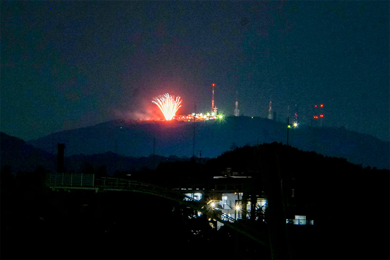 ひらつー事務所のある堤町の鍵屋別館から生駒山上遊園地の花火「ファイアーリュージョン2017」が見えています。
