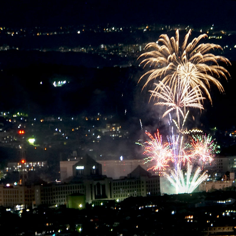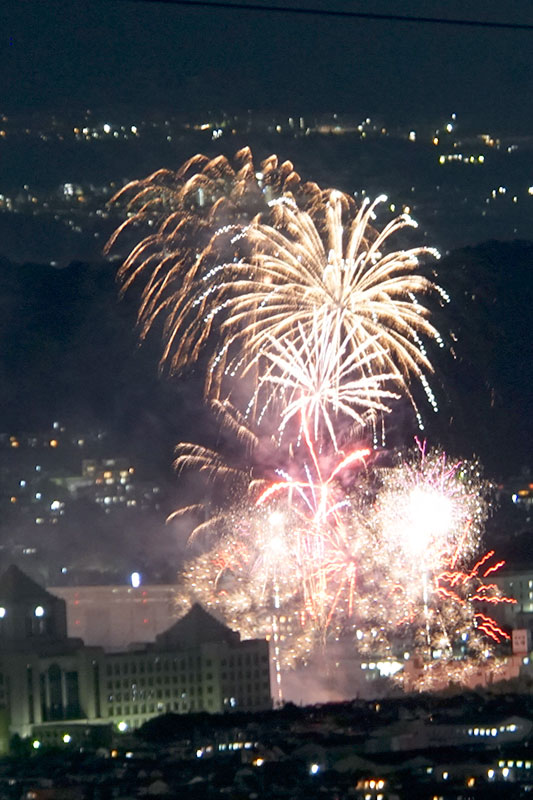 そして花火がはじまったのは20時40分ごろ。国見山の山頂にて1人で40分まったので喜びもひとしおです。国会議事堂のような大工大との花火のツーショット写真。
