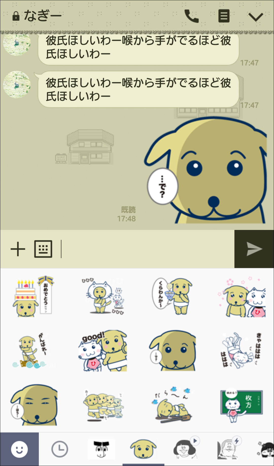 彼氏欲しいアピールといったどうしようもないモノに対しても、スタンプを持っているとくらわんこの非情な「…で?」を返すことができます。コミュニケーション殺しの1手。