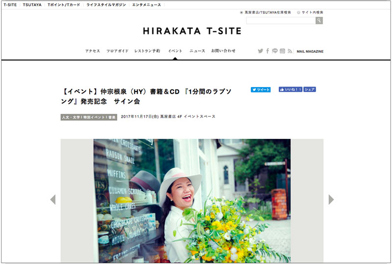 枚方T-SITEに「Song for..」「366日」などで有名な『HY』の仲宗根泉がやってくるみたい。11月17日