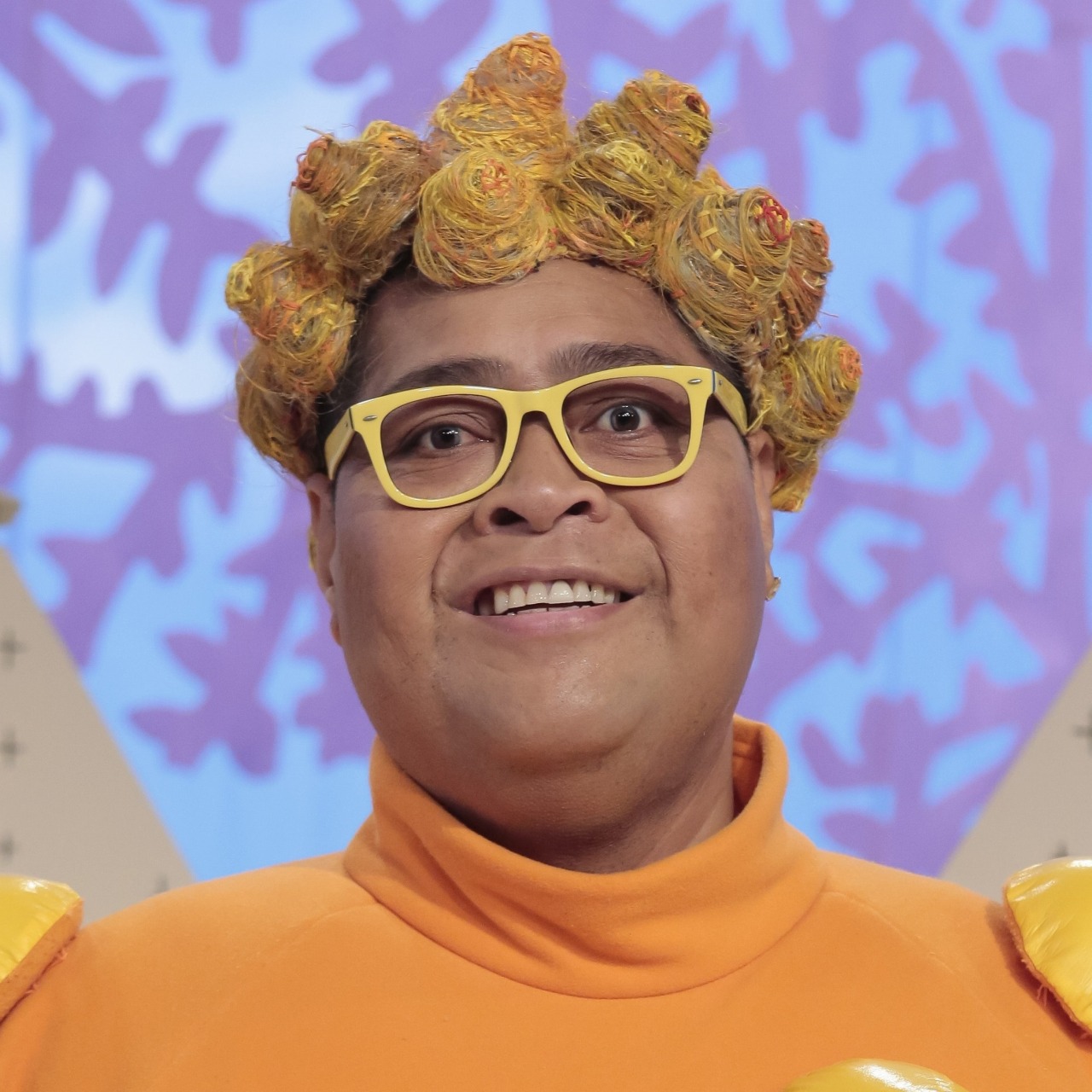 つづいてはラッキィ池田さん。ゾウのじょうろを頭につけている印象ですが、この写真では何か別のものがのっていますね。