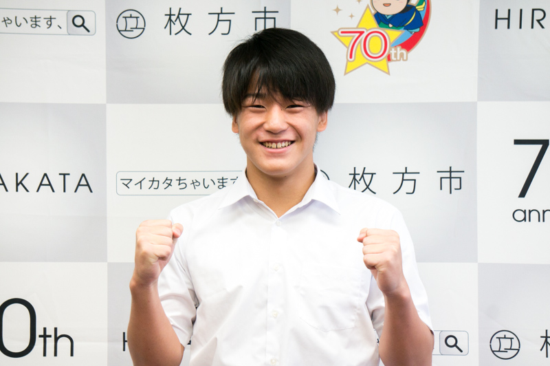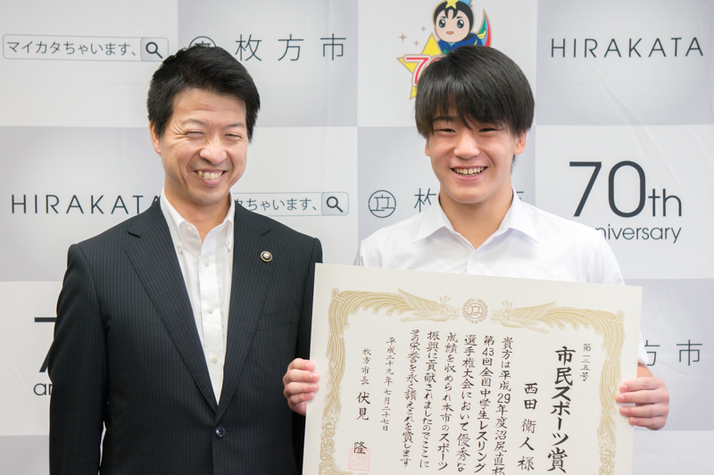 6月に開催された「全国中学生レスリング選手権大会男子73kg級」で優勝した、枚方中学校の西田衛人(にしだえいと)くんが本日7/27(木)に枚方市役所から市民スポーツ賞を授与されましたので、その様子を見に行ってきました。