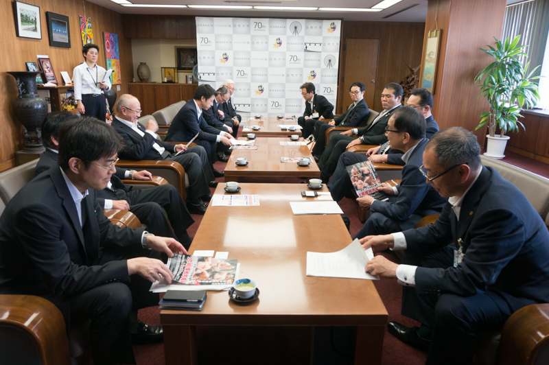 大相撲枚方場所にむけて玉ノ井親方や尾上親方らが市役所へ表敬訪問しにきてた