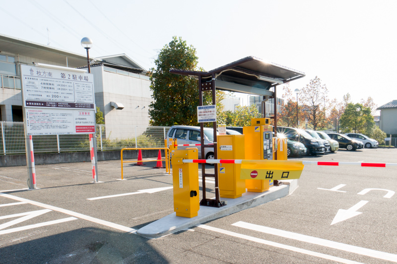スパバレイ枚方南の建物に隣接している第1駐車場。駐車券の発券機とゲートバーが設置されています。