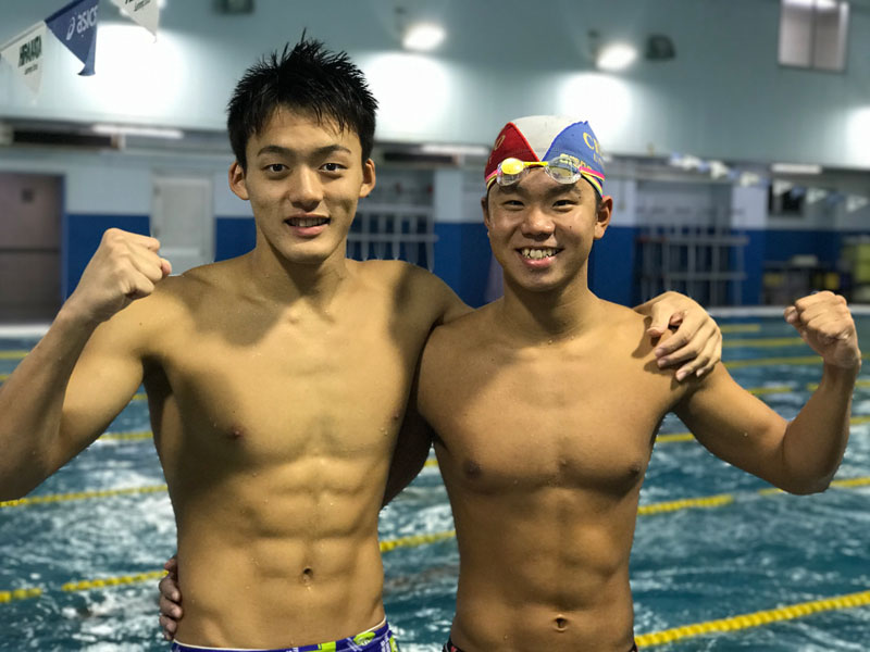 (宇野柊平選手(右)と、枚スイの姉妹校出身の中村海渡選手(左)。中村選手も一緒にインカレの報告にきていたそうで、中村選手は200m自由形のB決勝の2位だったそう)