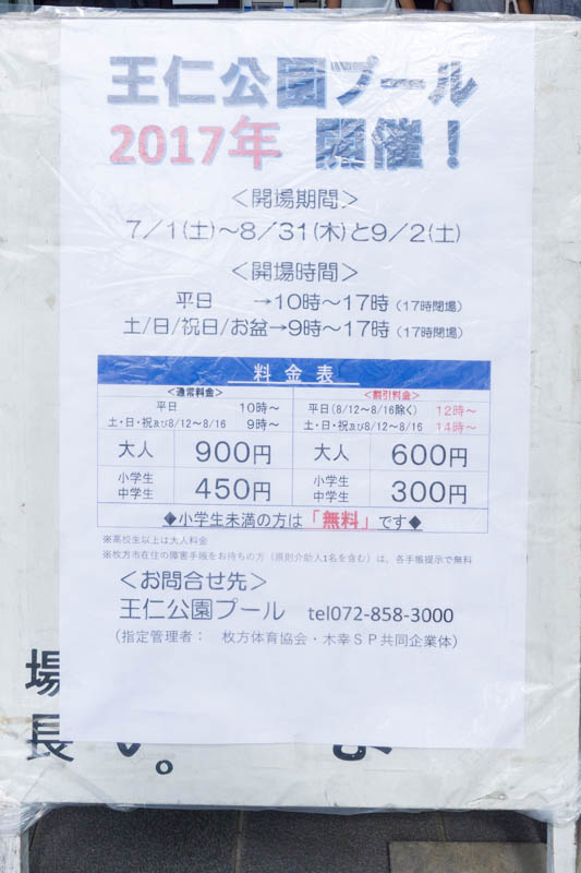 王仁公園のサイトに詳細が掲載されていて、プールの営業は本日7月1日(土)から8月31日(木)までの期間と、9月2日(土)。