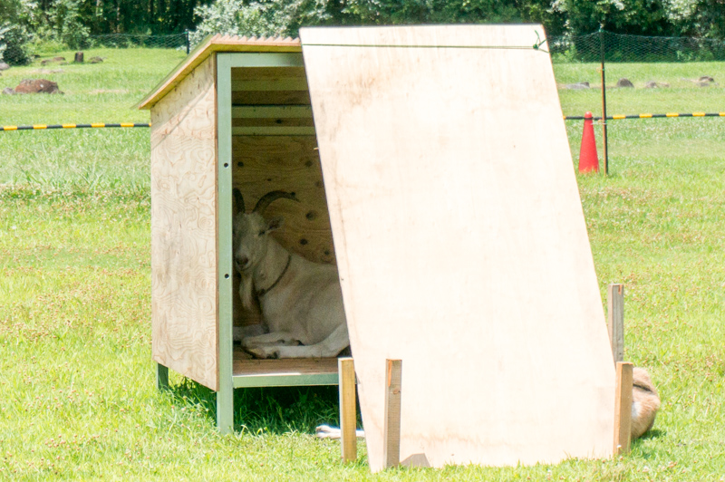 ヤギたちがいるエリアは赤色のカラーコーンとパーテションで囲われている部分。