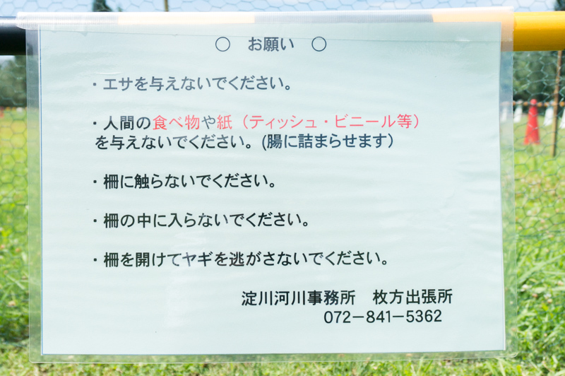 淀川河川事務所のお知らせによると、ヤギの除草は7月6日から淀川河川事務所横の堤防天端で試行していたようで、この場所での除草は7月24日から開始したとのこと。やぎーずという名前もお知らせに掲載されていました。