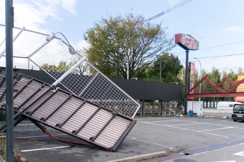 1号線ぞい穂谷川そばにあるフォレオの看板がお辞儀してるみたいになってる。そのほか台風の影響をうけた1号線ぞいのようす