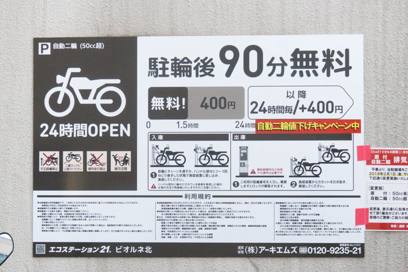自動二輪も100円安いです。こちらも前述のとおり、排気量制限が変更され、原付のところに小型自動二輪を停めることが2月1日から可能になる予定。