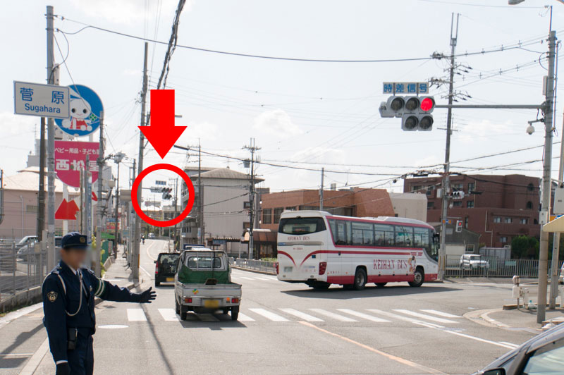 手前には信号がありますが、先頭のクルマが間違って赤信号を渡らないように警察の方が誘導していました。