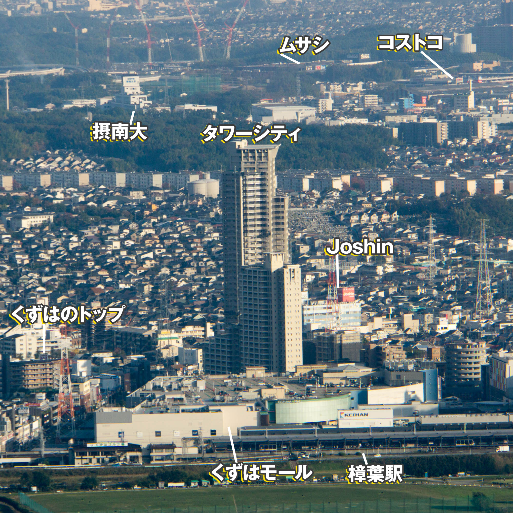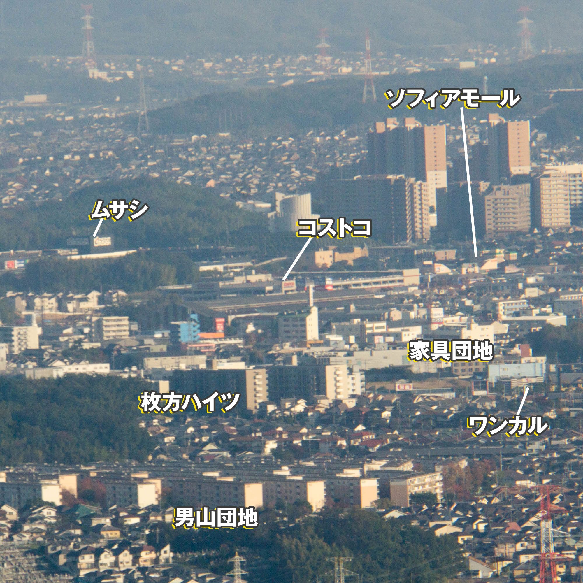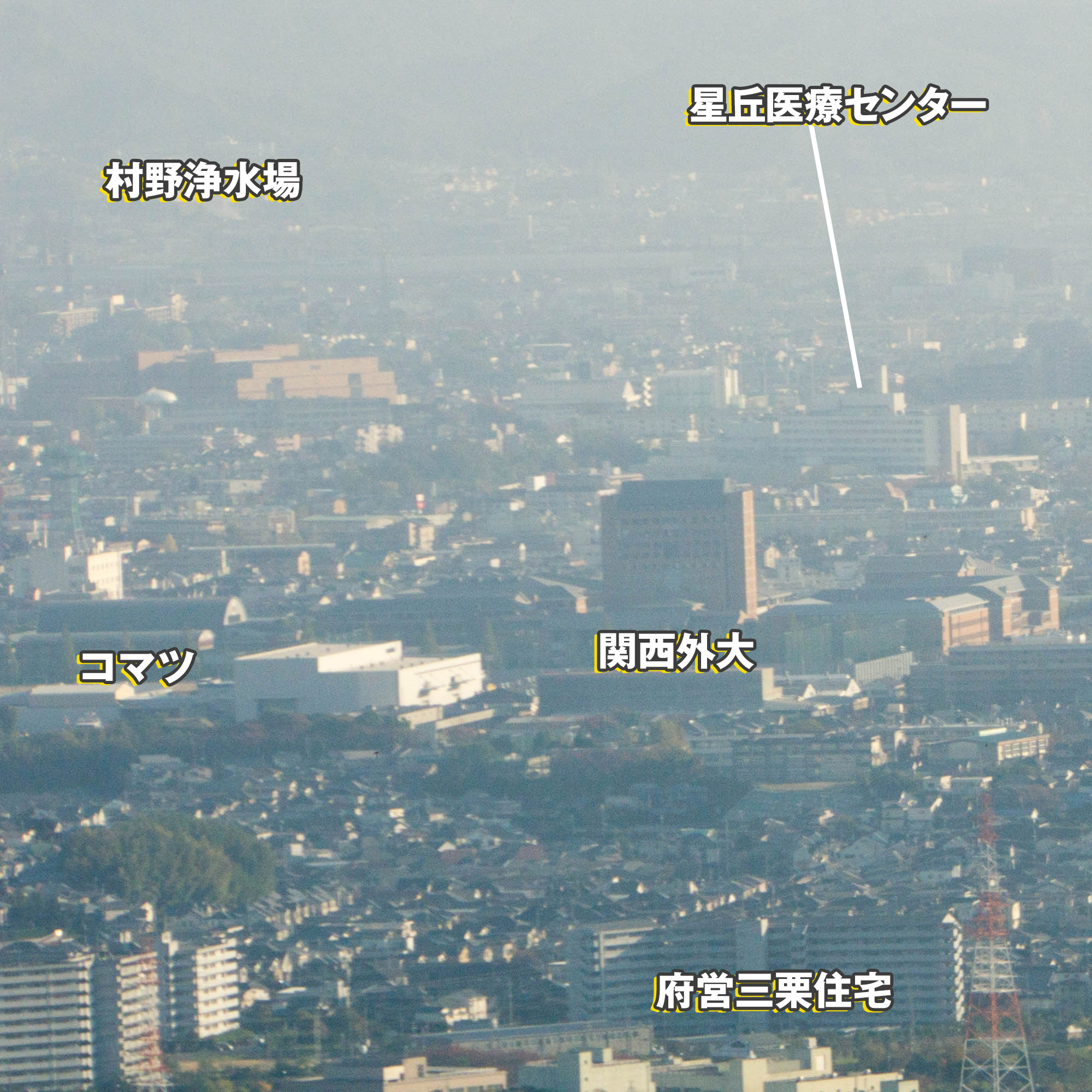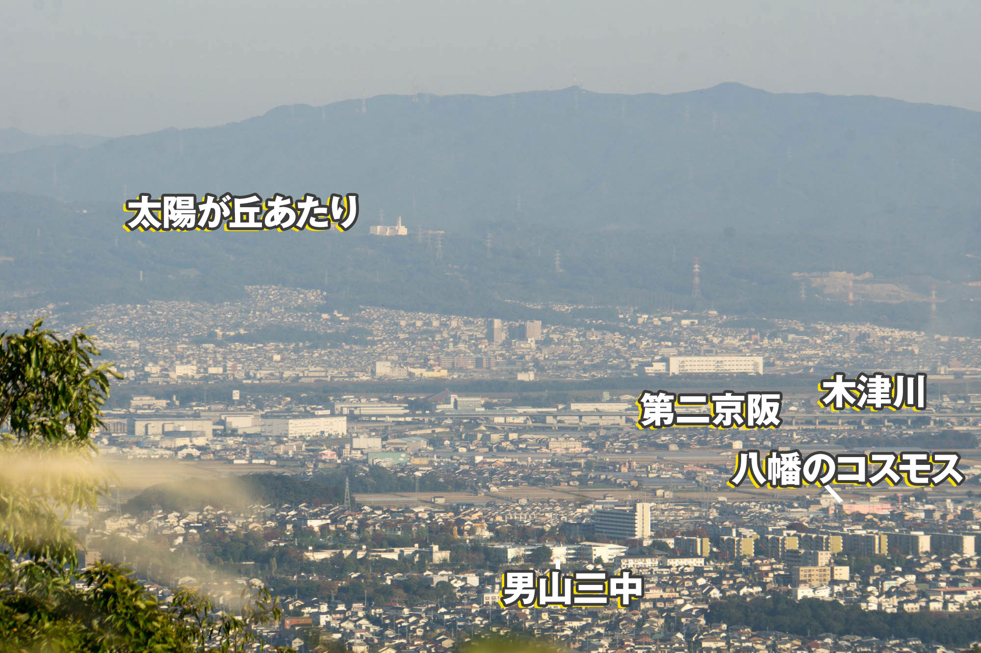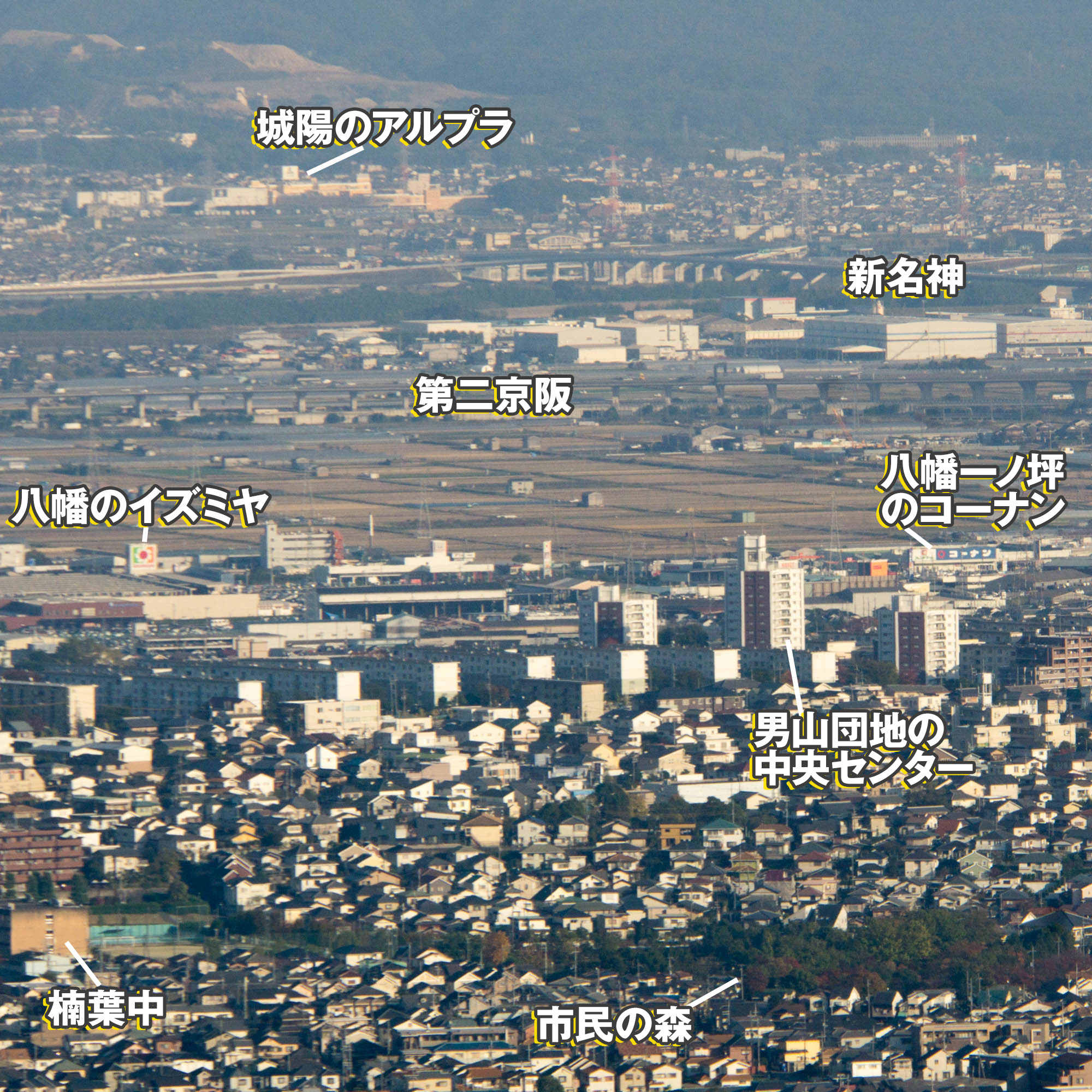 楠葉中や市民の森など、くずはの中でも北側のエリアと、八幡方面。城陽のアルプラが見えているのは驚きでした。