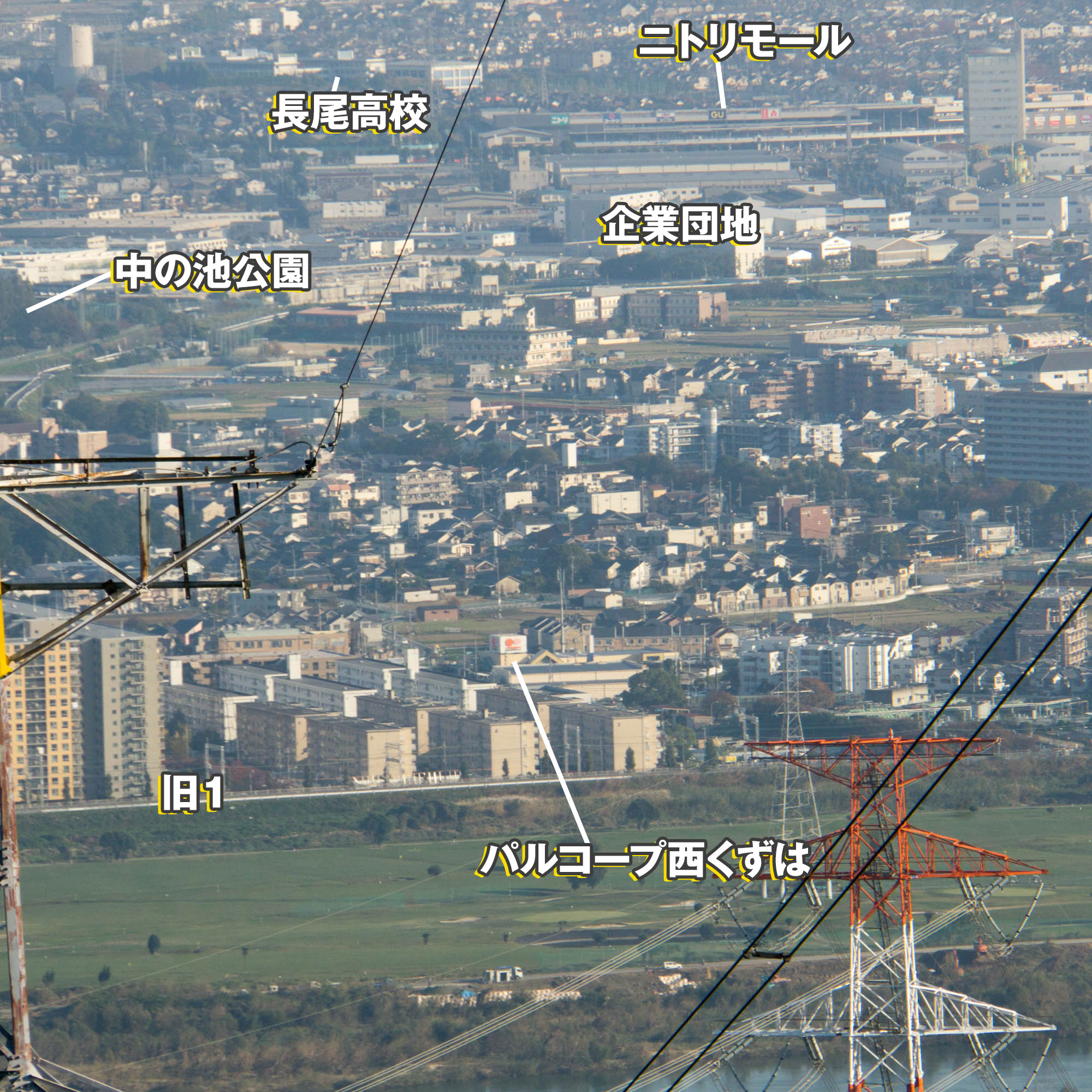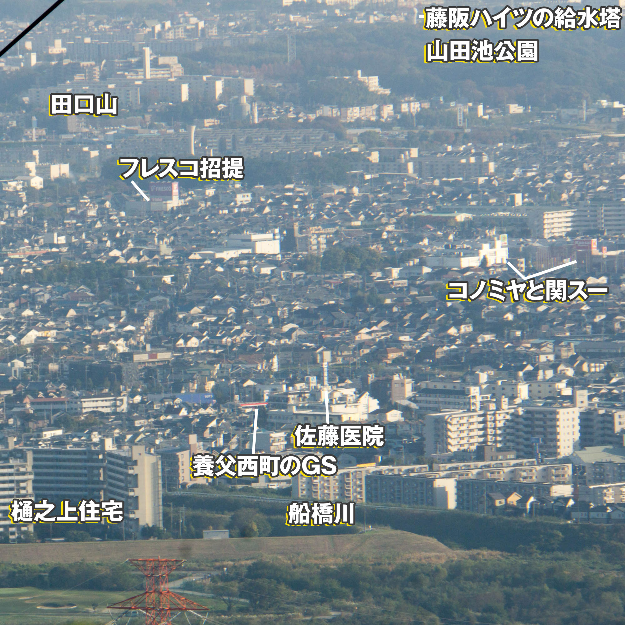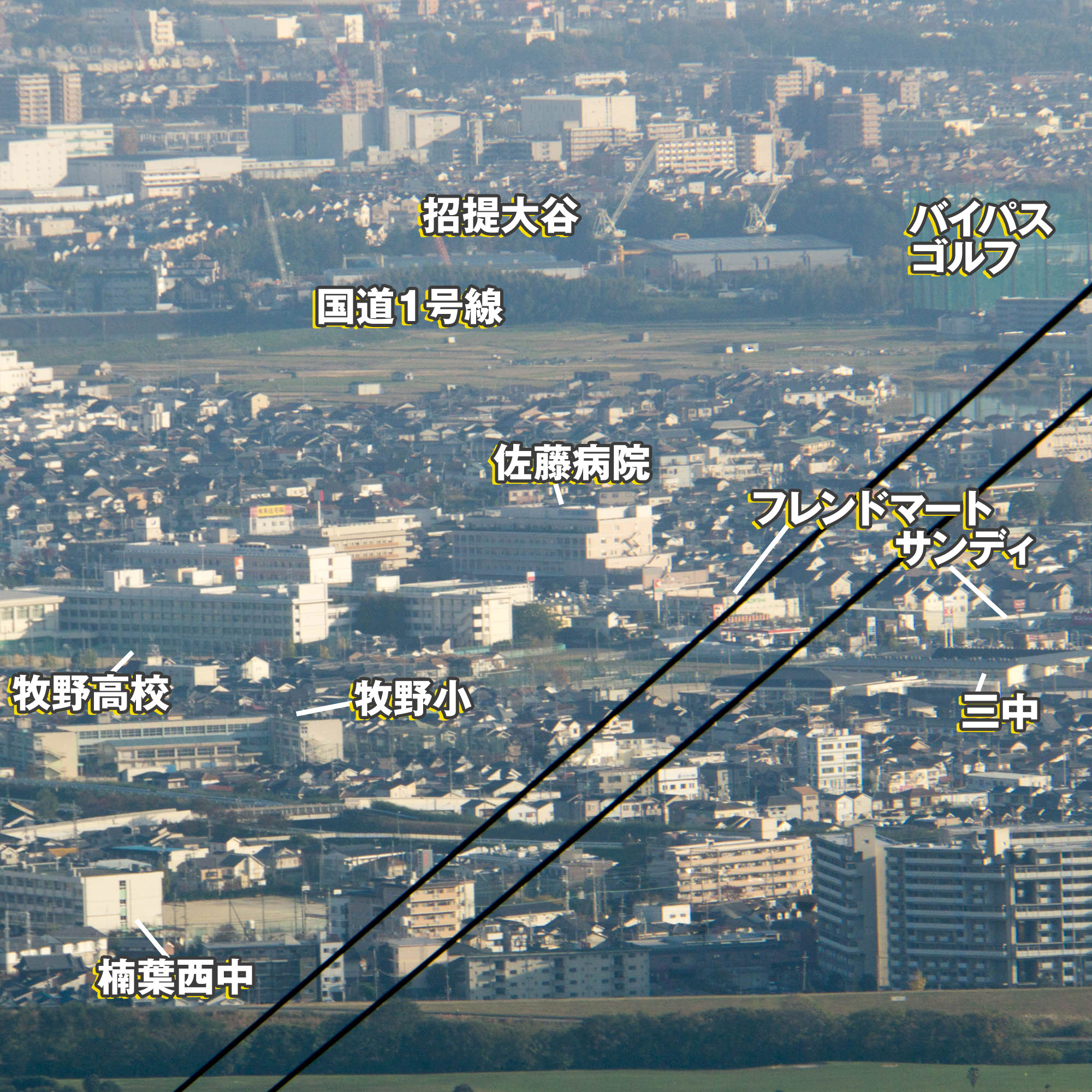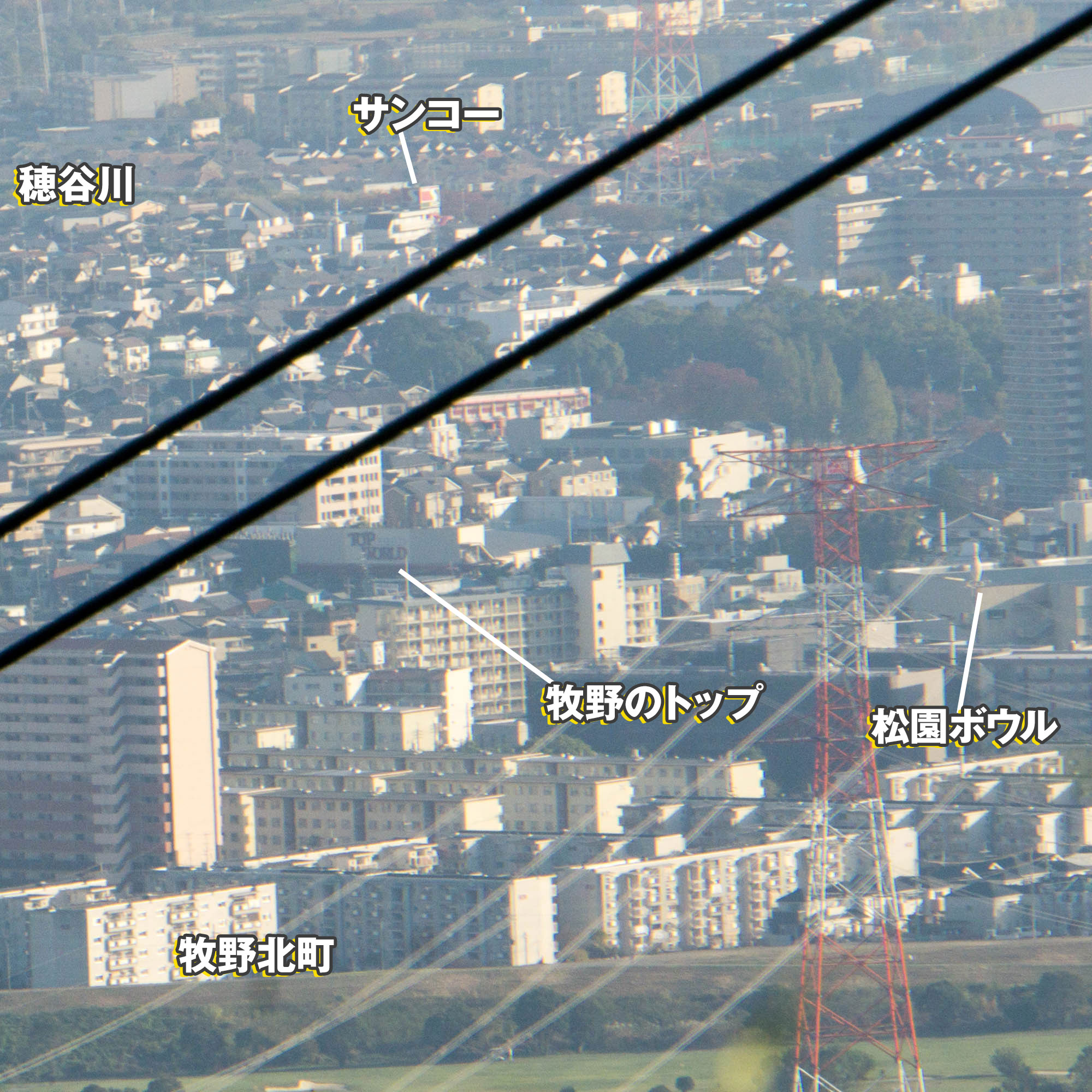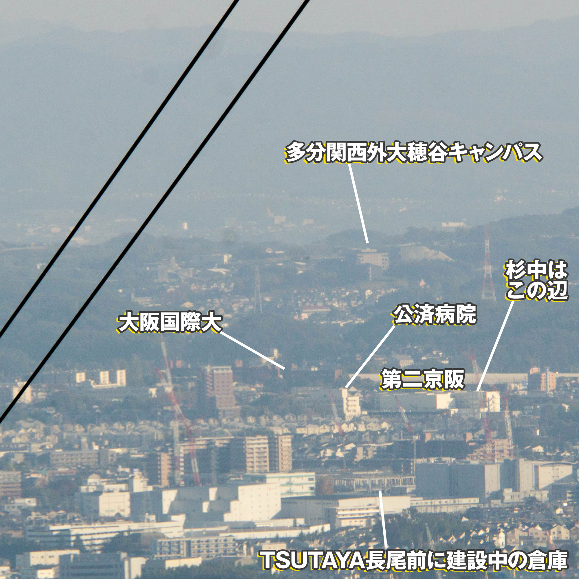 楠葉中や市民の森など、くずはの中でも北側のエリアと、八幡方面。城陽のアルプラが見えているのは驚きでした。