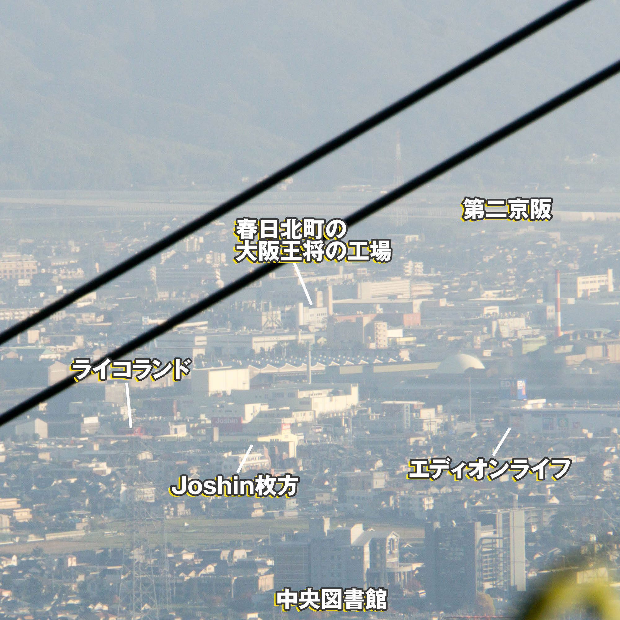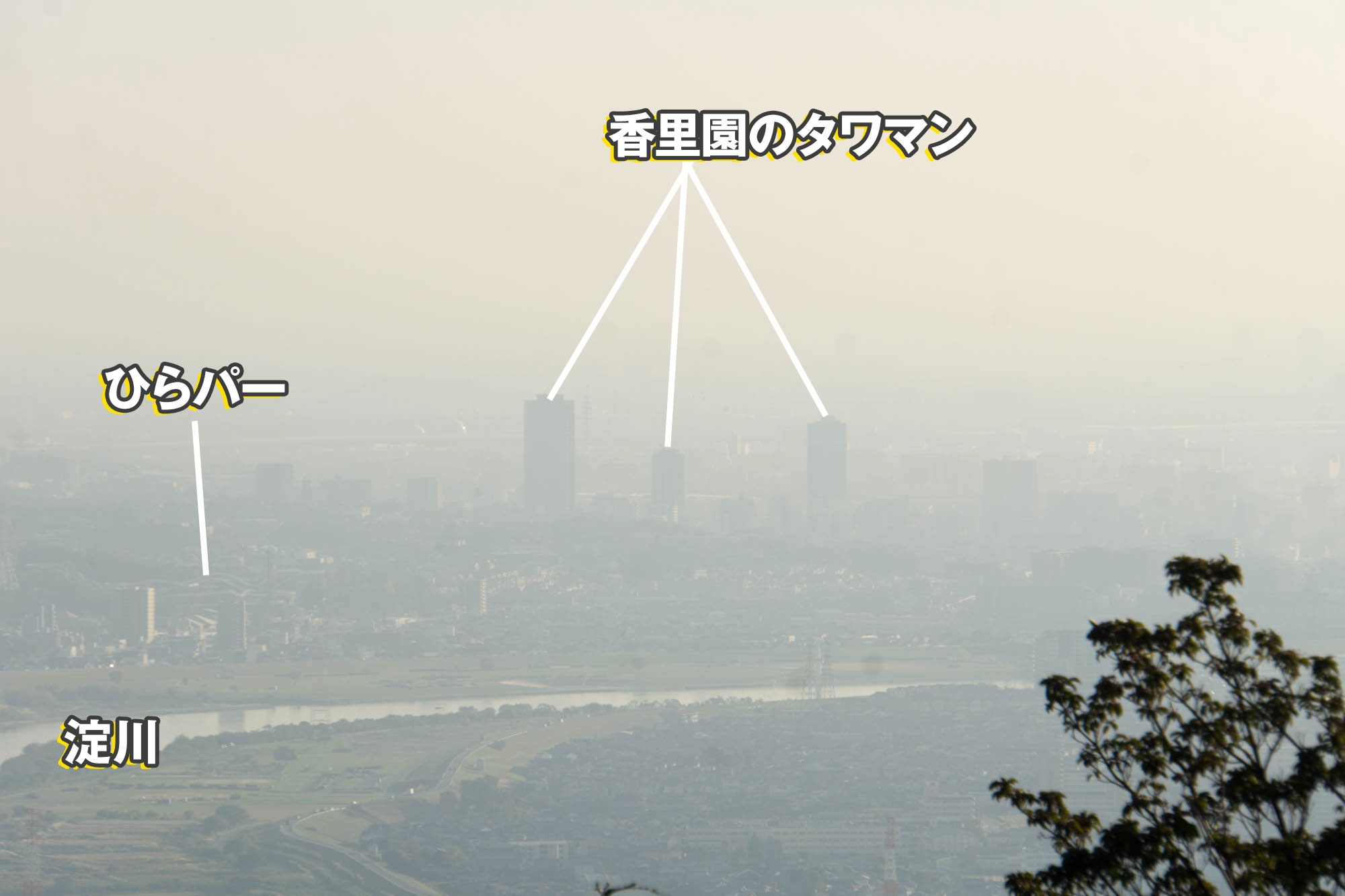 そこに掲載されているとおり、枚方側を望むことができるのは三角点を北に進んでしばらくした位置だと思い、結構先まで進んだんですが、一部しか見れないところくらいしかありませんでしたので景色目当てならマップは信用しないほうがいいです。